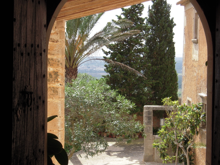 Durch ein kleines Tor gelangt man zu der Rückseite der idyllischen Klosteranlage. Links hinunter führt eine Treppe zu einer kleinen Aussichtsplattform, die einen herrlichen Blick über die Gegend bietet. Von der Plattform kann man wunderbar einen großen Teil der Südostküste überblicken. Auf der anderen Seite streift der Blick über Es Puig de Sant Salvador, Es Puig de Santueri, Es Puig Gros sowie Sa Penya Bosca. An sonnigen und klaren Tagen kann man von hier sogar bis nach Cabrera, der kleinen Schwesterinsel Mallorcas, sehen.