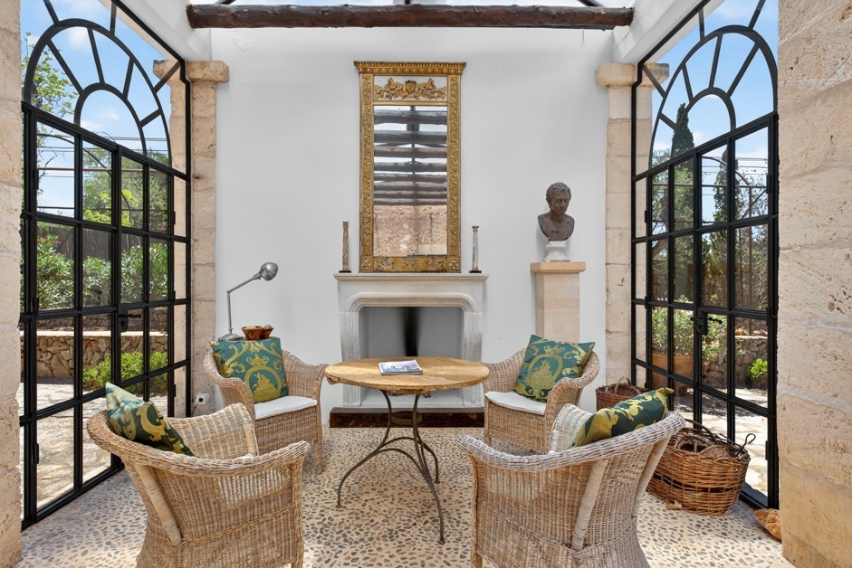 Der Außenbereich verbindet Innen und Natur auf harmonische Weise. Eine überdachte Porche sowie ein verglaster Wintergarten mit Kamin schaffen geschützte Plätze zu jeder Jahreszeit. Der Pool ordnet sich dezent in die Bepflanzung ein, alte Zypressen gliedern das Grundstück und rahmen den Blick in die Weite. Hier entstehen stille Morgen, sonnige Nachmittage unter Bäumen und lange Abende am Kamin – drinnen wie draußen. Die beliebte Stadt Santanyí ist nur wenige Minuten entfernt; sie vereint historische Sandsteinarchitektur, Kunstgalerien und eine vielfältige Gastronomie. Die Strände der Südostküste liegen in kurzer Distanz, der Flughafen Palma ist in etwa 45 Minuten erreichbar.