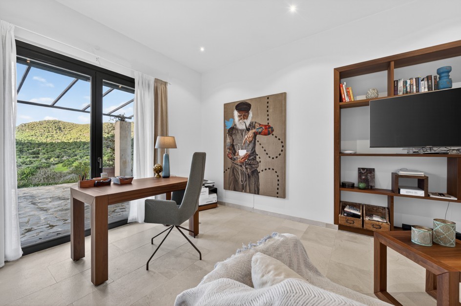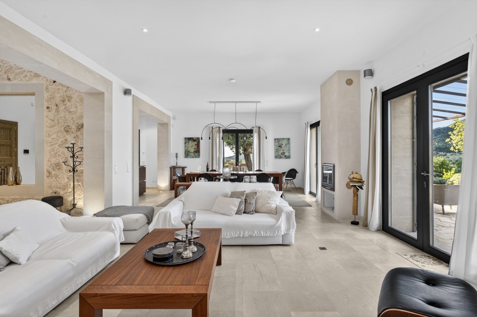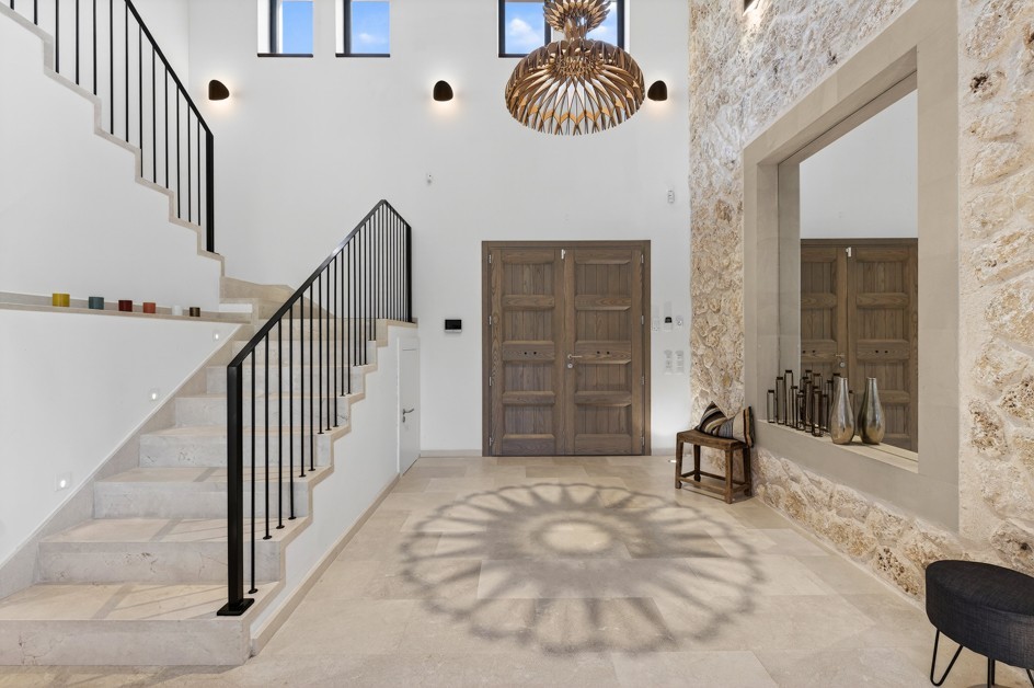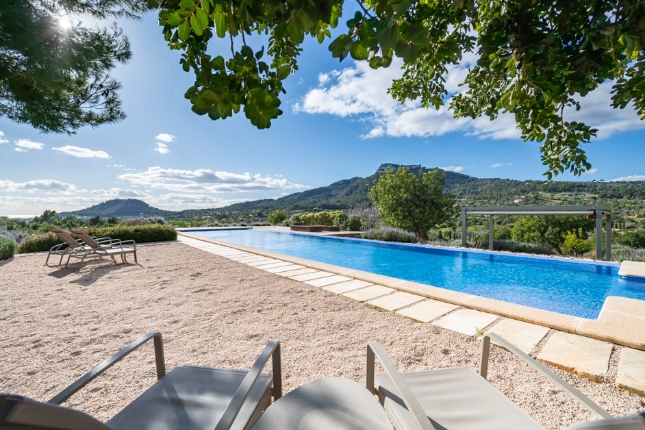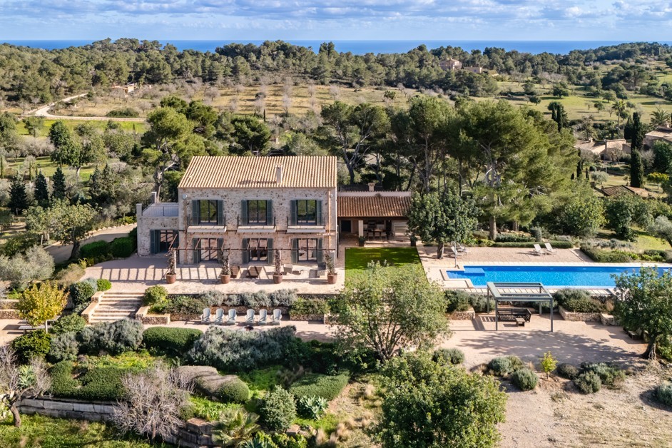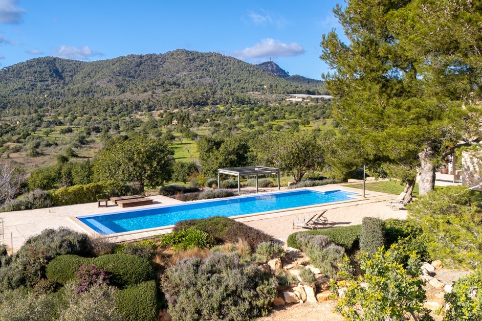 Der Außenbereich ist auf Nutzung und Ausblick ausgelegt: Mehrere Terrassen, ein überdachter Barbecue-Bereich und ein ca. 18 x 5 m großer, beheizbarer Pool schaffen Raum für Aufenthalt und Bewegung. Die Südwest-Ausrichtung sorgt für lichtdurchflutete Innenräume und lange Abendstunden. Technisch verfügt die Finca über Fußbodenheizung, einen eigenen Brunnen mit getrennten Wasserspeichern für Haus und Garten sowie Anschluss an das öffentliche Stromnetz. Portocolom, verschiedene Buchten des Südostens und der Golfplatz Vall d’Or sind in wenigen Minuten erreichbar, der Flughafen Palma liegt rund 50 Minuten entfernt.