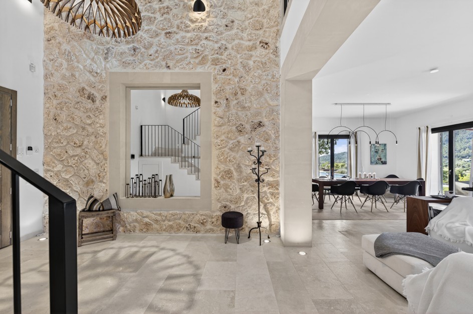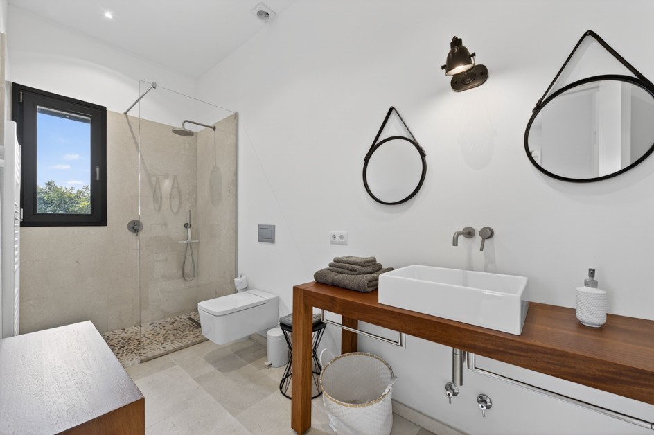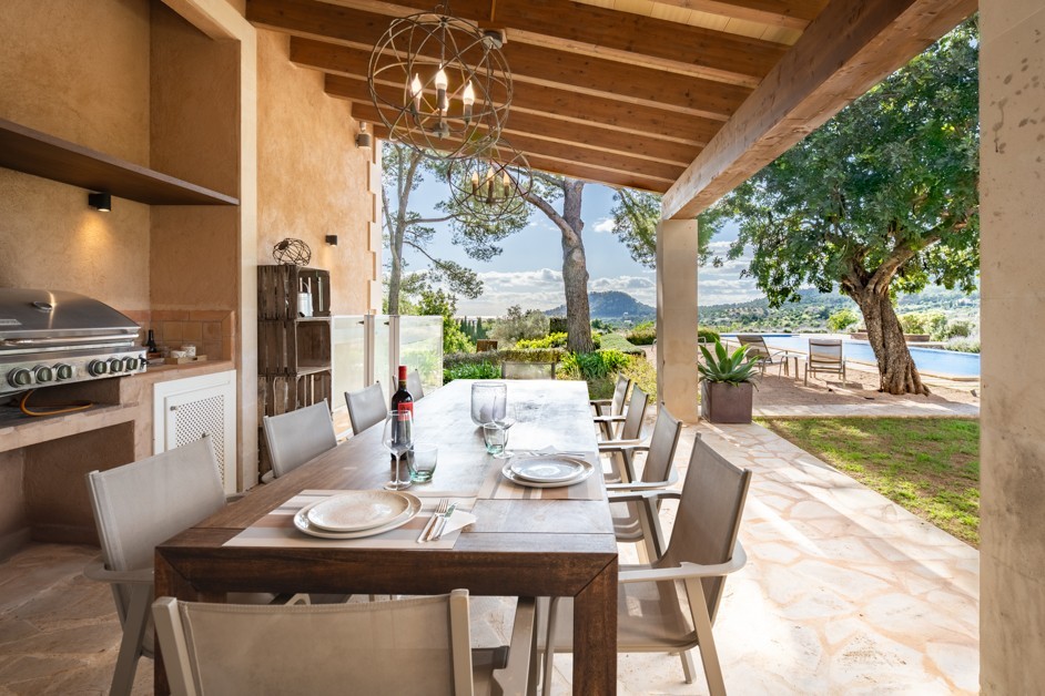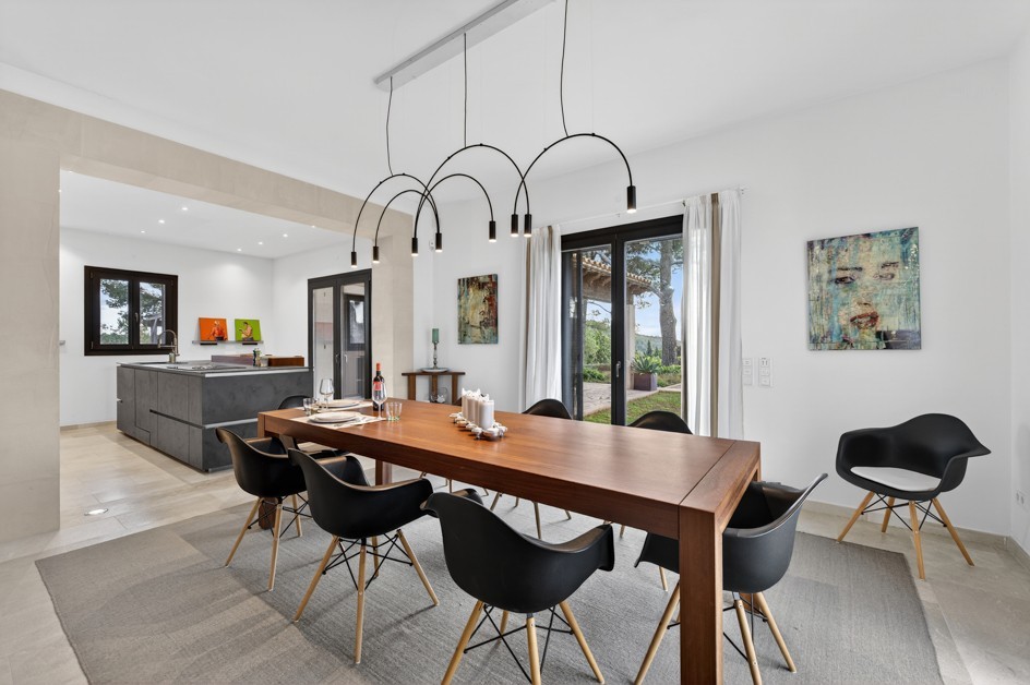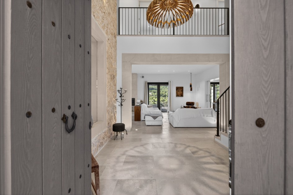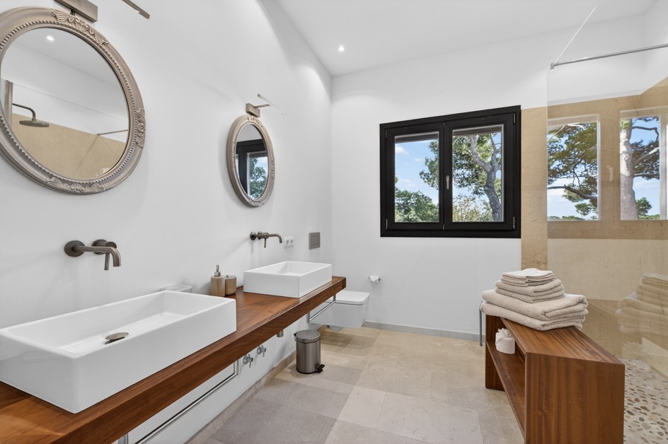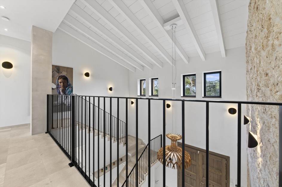 Der Außenbereich ist auf Nutzung und Ausblick ausgelegt: Mehrere Terrassen, ein überdachter Barbecue-Bereich und ein ca. 18 x 5 m großer, beheizbarer Pool schaffen Raum für Aufenthalt und Bewegung. Die Südwest-Ausrichtung sorgt für lichtdurchflutete Innenräume und lange Abendstunden. Technisch verfügt die Finca über Fußbodenheizung, einen eigenen Brunnen mit getrennten Wasserspeichern für Haus und Garten sowie Anschluss an das öffentliche Stromnetz. Portocolom, verschiedene Buchten des Südostens und der Golfplatz Vall d’Or sind in wenigen Minuten erreichbar, der Flughafen Palma liegt rund 50 Minuten entfernt.