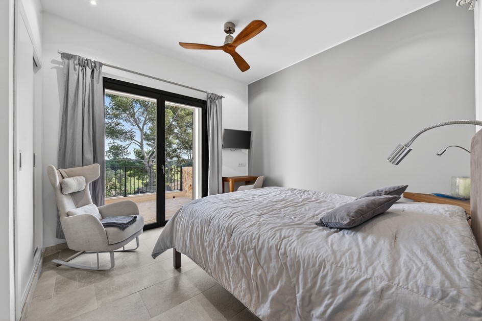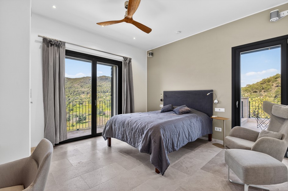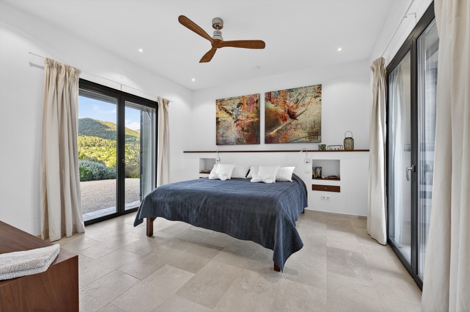 Das Obergeschoss ist als privater Bereich konzipiert. Drei großzügige Schlafzimmer, jeweils mit Bad en Suite und Deckenventilatoren, bieten Rückzug und Komfort. Private Balkone eröffnen einen weiten Blick über die umliegende Landschaft bis zum Mittelmeer.