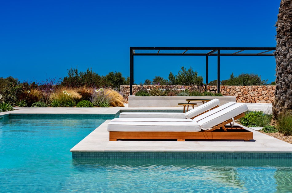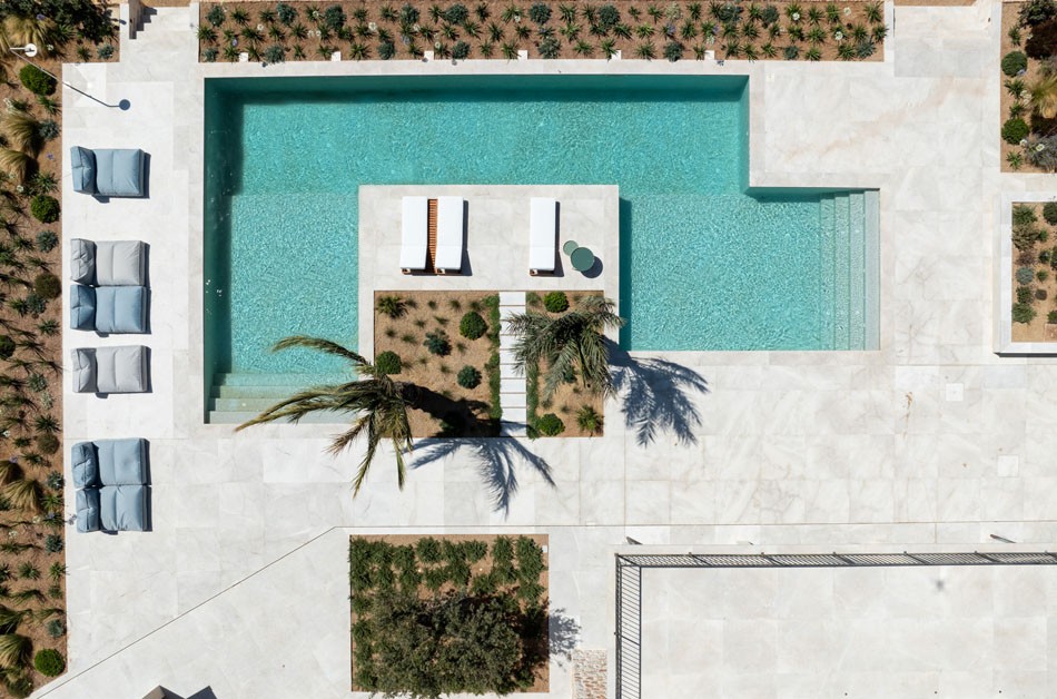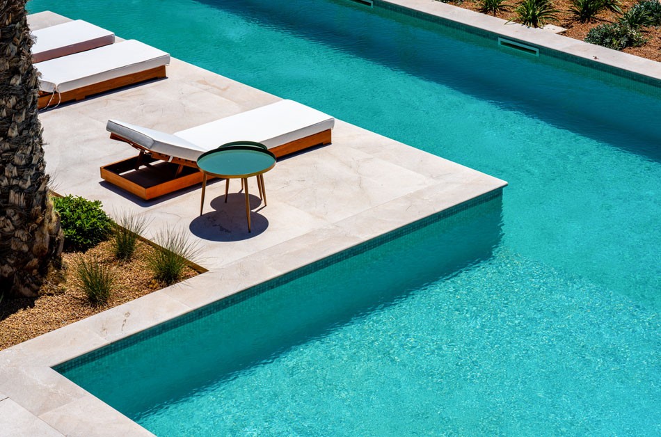 Der besonders gestaltete, über 100 m² große Swimmingpool ist von einer großzügigen Sonnenterrasse umgeben, die vielfältige Aufenthaltsmöglichkeiten bietet. Hier schließt sich ein Outdoor-Essbereich an, der bereits über einen Anschluss für eine Außenküche verfügt.
