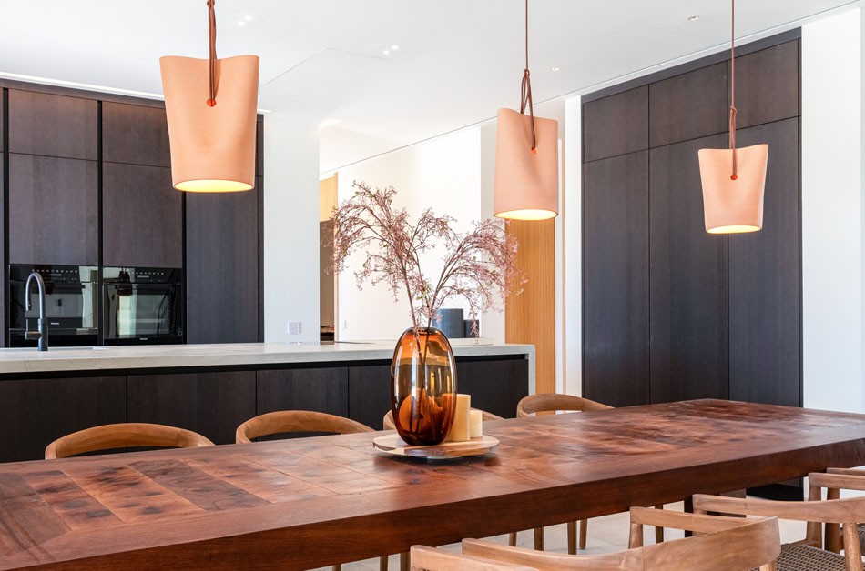 Mit den bodentiefen Fenstern harmoniert das Innere mit dem Äußeren in perfekter Balance. Auf der gesamten Südseite des Hauses gelangt man über teils überdachte Terrassen in den ansprechenden mediterran angelegten Garten, in dem sich das ansprechende Beleuchtungskonzept des Innenbereichs, in der Außenanlage fortsetzt.