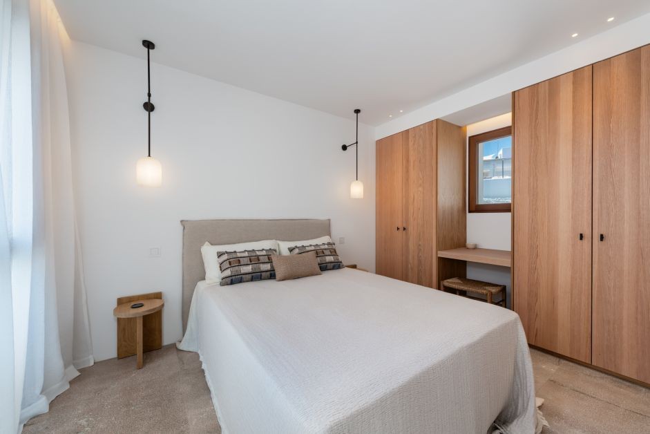 Mediterranean arches and colorful accents on the balcony bring the charismatic atmosphere of Porto Colom’s old town directly into your new home. Four generous bedrooms, each with its own en-suite bathroom, provide ample space for privacy and comfort. The exclusive master suite impresses with access to an approx. 31 m² protected courtyard and an adjacent room that can be ideally used as an office, walk-in closet, or fitness area.